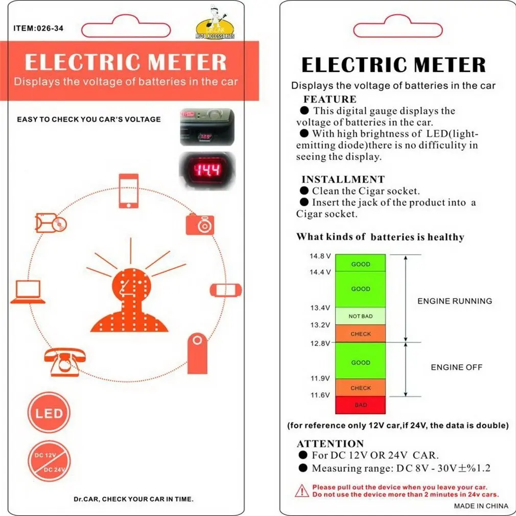 LED display cigarette lighter electric voltage meter for auto car battery.